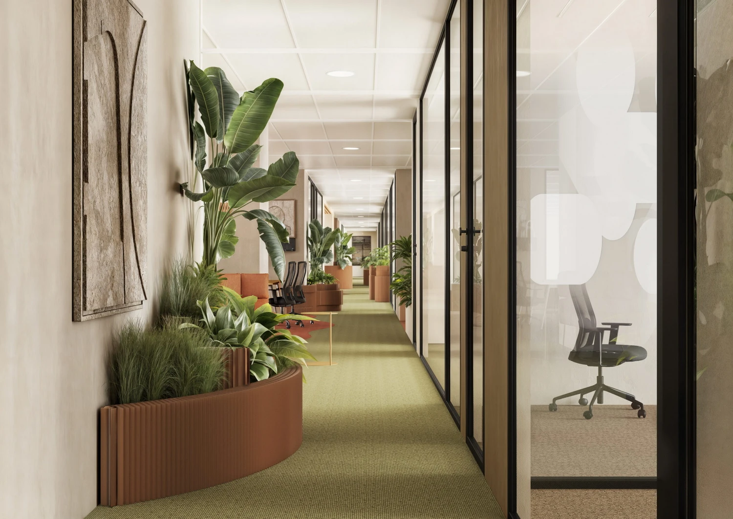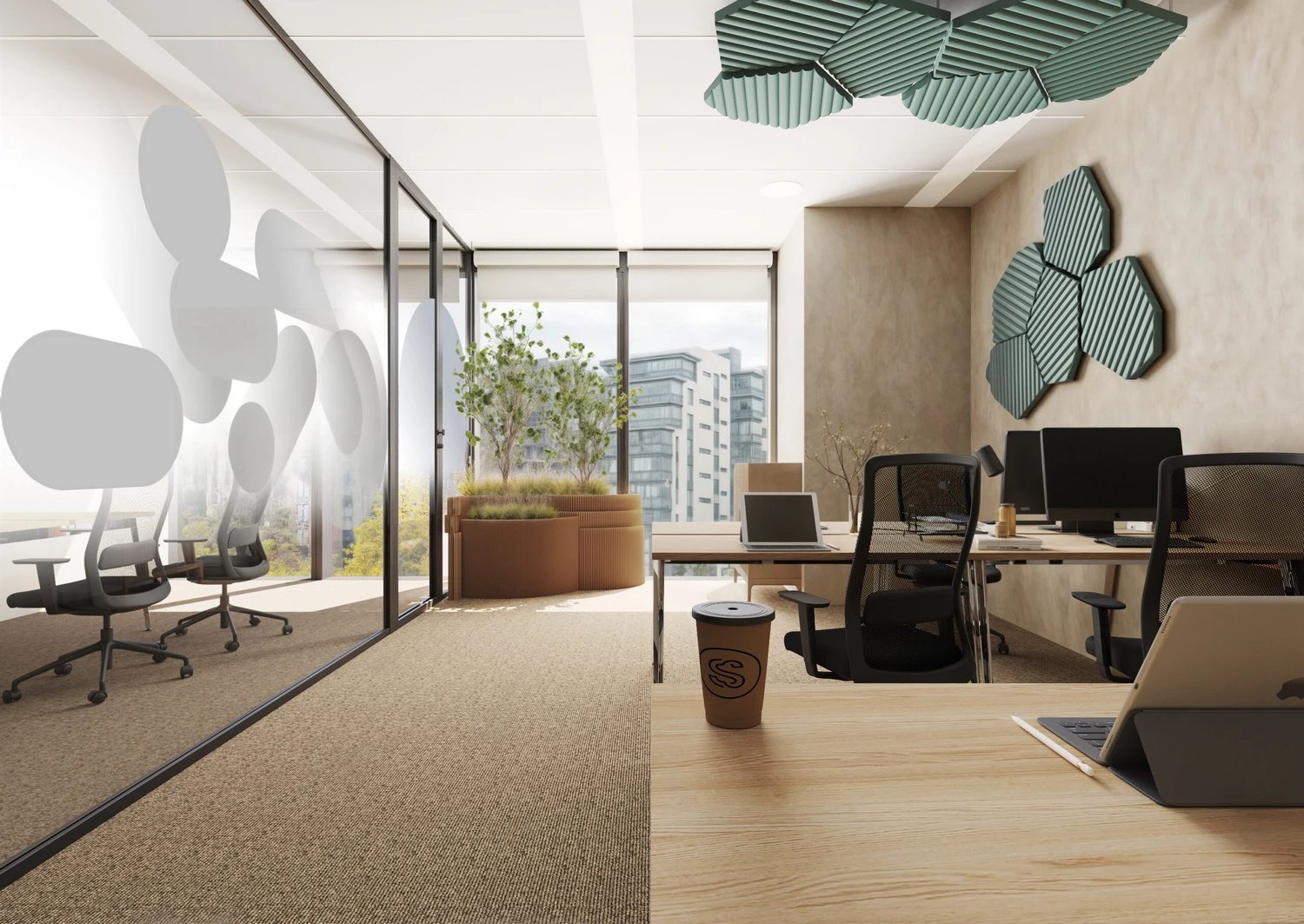 - Customizable spaces in a modern and green environment.